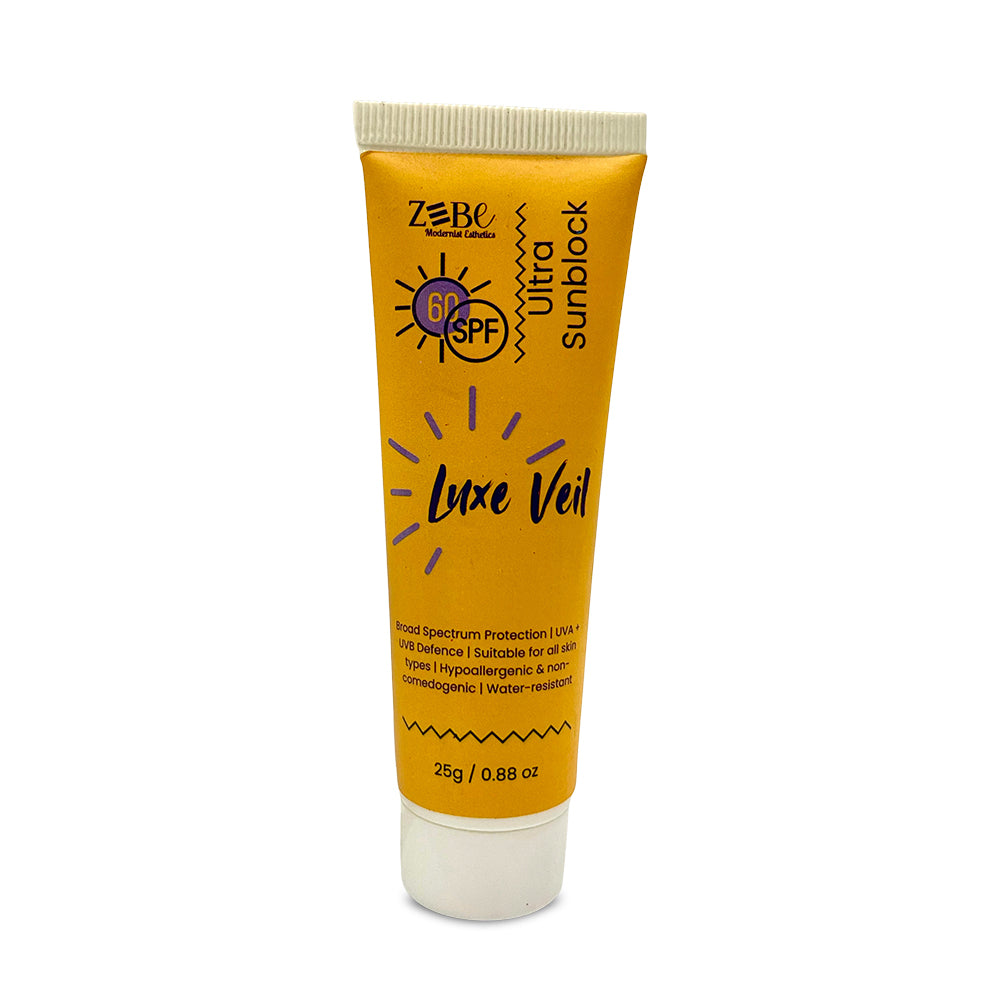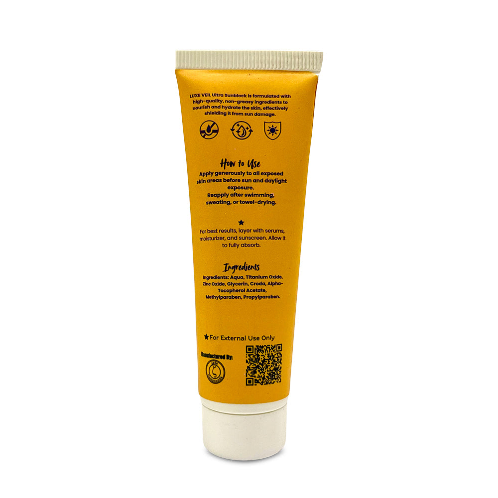 LUXE VEIL ++++ Ultra Sunblock SPF 60 is a premium, skin-friendly sunblock designed to provide powerful UVA & UVB defense while keeping your skin nourished, hydrated, and comfortable. Its non-greasy formula creates a protective veil over the skin, shielding it from sun damage without clogging pores.