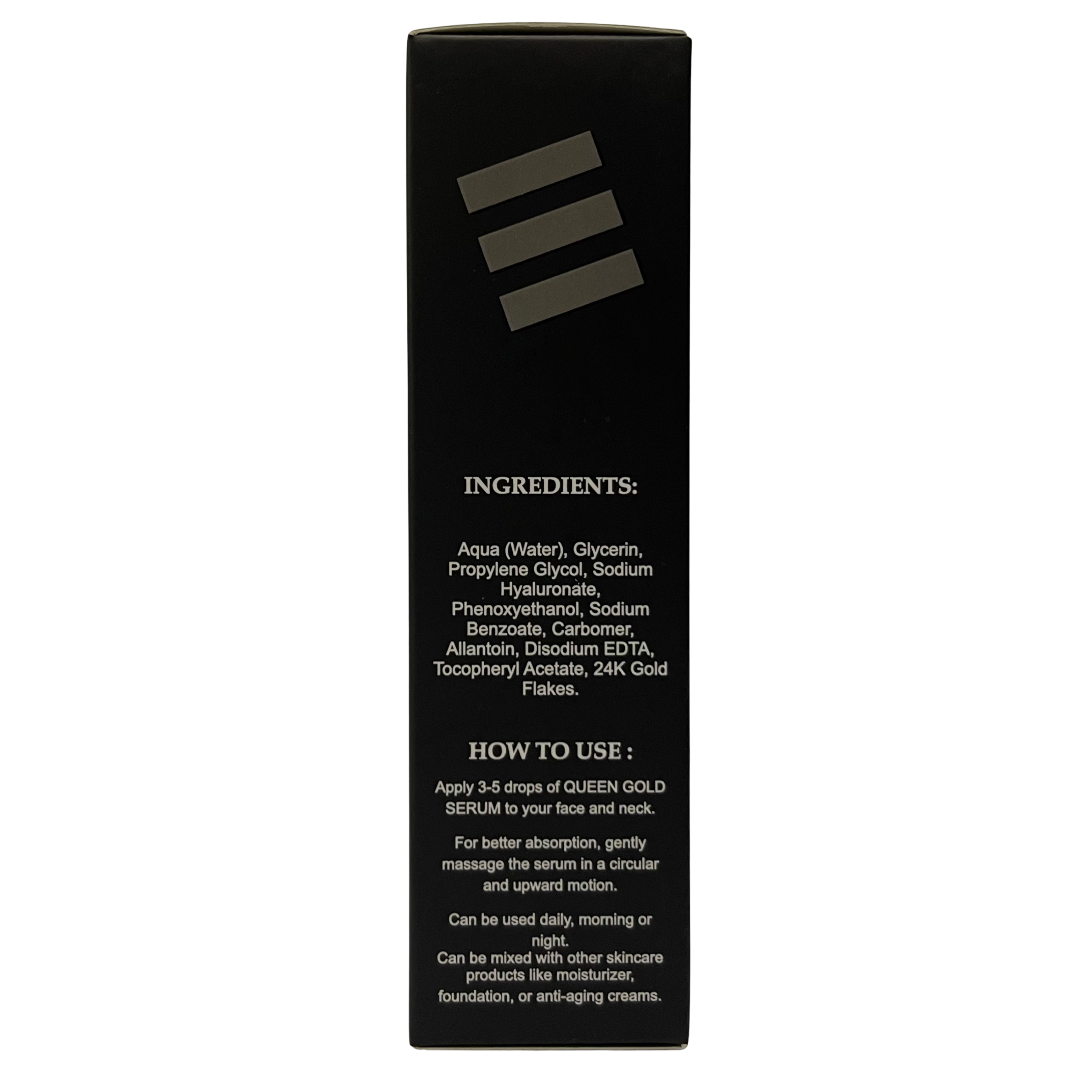 Apply 3-5 drops of Queen Gold Serum to your face and neck. For optimal absorption, gently massage in a circular and upward motion. Use it daily, morning or night, as part of your skincare regimen. You can also mix it with other products, like foundation or moisturizers, for enhanced benefits.